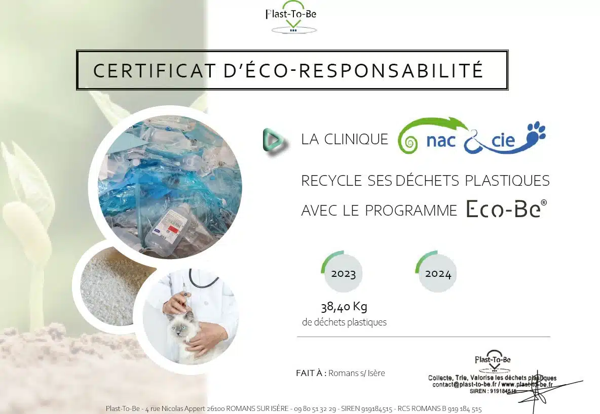 Nous sommes fiers de vous annoncer que la clinique Nac et Compagnie vient de recevoir une certification d’éco-responsabilité pour le recyclage des plastiques.